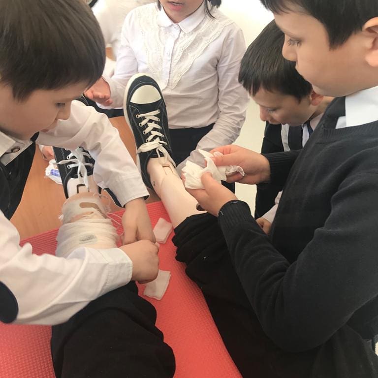 Учащимся школы также наглядно было показано как оказывать первую медицинскую помощь (прямое давление на рану, чтобы остановить кровотечение и перевязка) на манекене "Гоше", который полноценно имитирует пострадавшего человека.