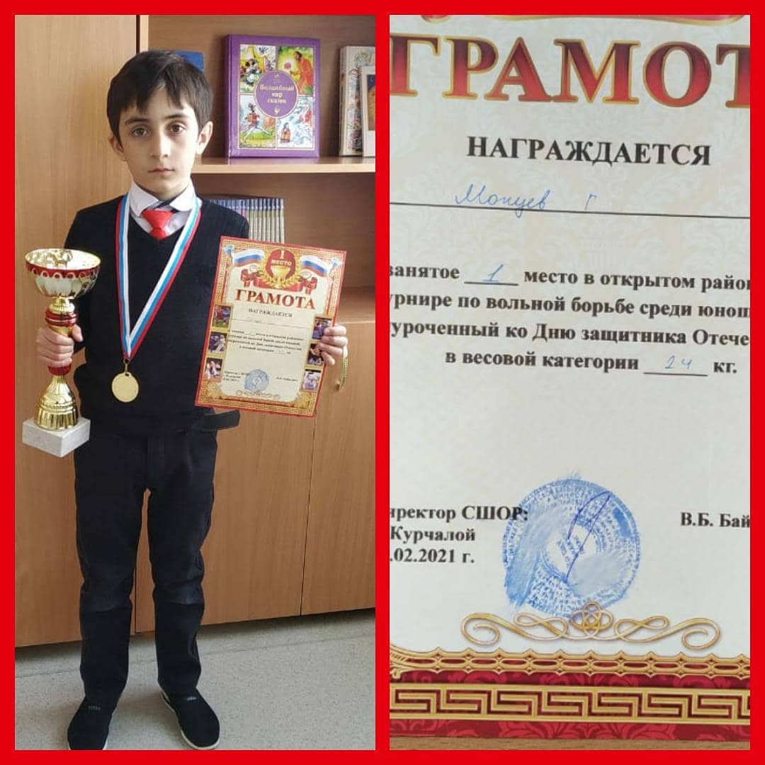 Ученик 3 "А" класса Мочуев Гелани занял 1-ое место в открытом районном турнире по вольной борьбе, приуроченный ко Дню защитника отечества.