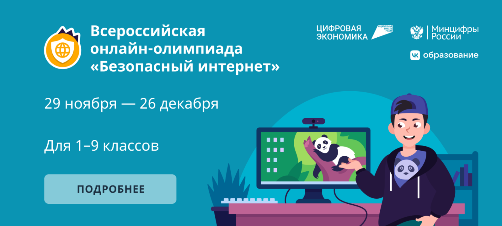 02.12.2022Всероссийская онлайн-олимпиада «Безопасный интернет» для учеников 1-9 классов пройдёт с 29 ноября по 26 декабря 2022 года. Олимпиада проводится образовательной онлайн-платформой Учи.ру и компанией VK при поддержке национального проекта «Цифровая экономика» и Минцифры России. Участие для всех школьников из всех регионов бесплатное.